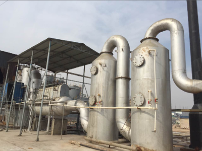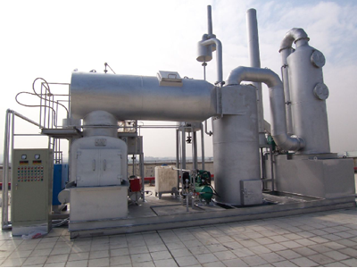 废液和压缩空气经管路控制系统进入雾化系统,废液雾化后喷入燃烧室,并依次通过迷宫除尘室和二次燃烧室,废液中的有机物被焚烧,水分被蒸发。焚烧产生的高温烟气进入空气换热器,然后依次通过两级急冷、吸附塔,烟气中的微小粉尘及有害物质(SO2、HCl等)被捕集吸收,经处理后的干净气体由引风机引入烟囱,排入大气。